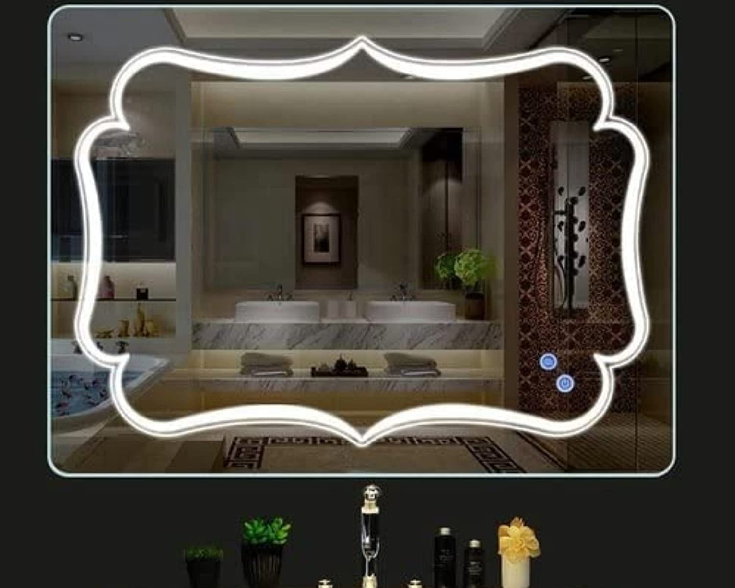 bathroom. Two detached smart touch buttons are to control the LED lights and anti-fog of the mirror. This mirror is made of copper-free & environmentally friendly materials, which are corrosion free and makes the mirror more durable. | Square/Round Lighted Sikri Modern Wall Mirror LED Bathroom Mirror, Anti-Fog Touch Switch Smart Makeup Vanity Mirror w/ 6500K High Lumen Lights.